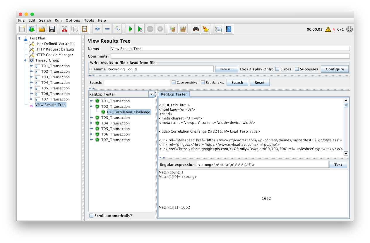 We used the RegExpn Tester in the Tree View listener to test our regular expression directly on sampler's response data.